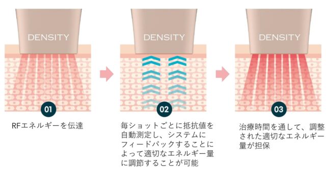 DENSITYには、1回の照射ごとに肌の抵抗値を測定する、リアルタイムインピーダンスチェック機能が搭載されています。皮膚の水分量や厚みには個人差がありますが、1照射ごとに皮膚の抵抗値(インピーダンス)を測定することで、患者様一人一人に合わせた施術を行うことができるようになりました。